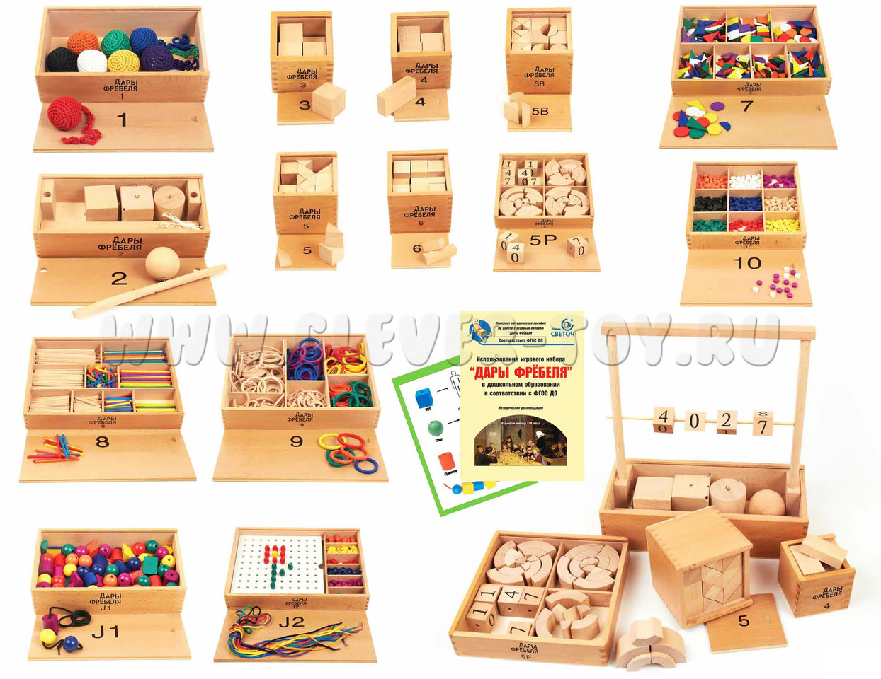 Игровой набор "Дары Фребеля" изготовлен из качественных натуральных материалов (дерева и хлопка). В комплекте 14 модулей и 6 методических пособий соответствующих ФГОС ДО.