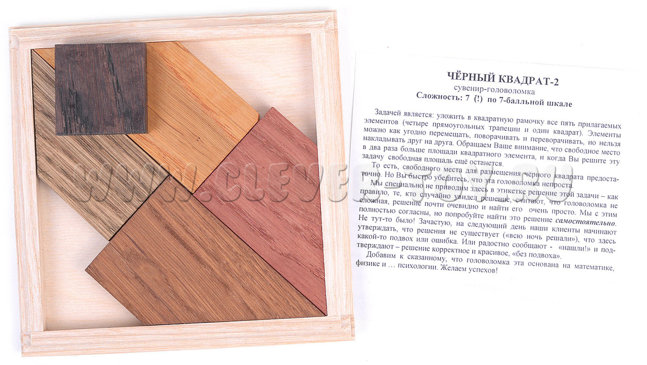 Уложить в квадратную рамочку все 5 предлагаемых элементов (четыре прямоугольных трапеции и один квадрат). Элементы можно как угодно перемещать, поворачивать и переворачивать, но нельзя накладывать друг на друга. Свободное место в два раза больше площади квадратного элемента, и когда вы решите эту задачу, свободная площадь еще останется. Свободного места для размещения чёрного квадрата более чем достаточно. Но вы быстро убедитесь, что эта головоломка не проста.