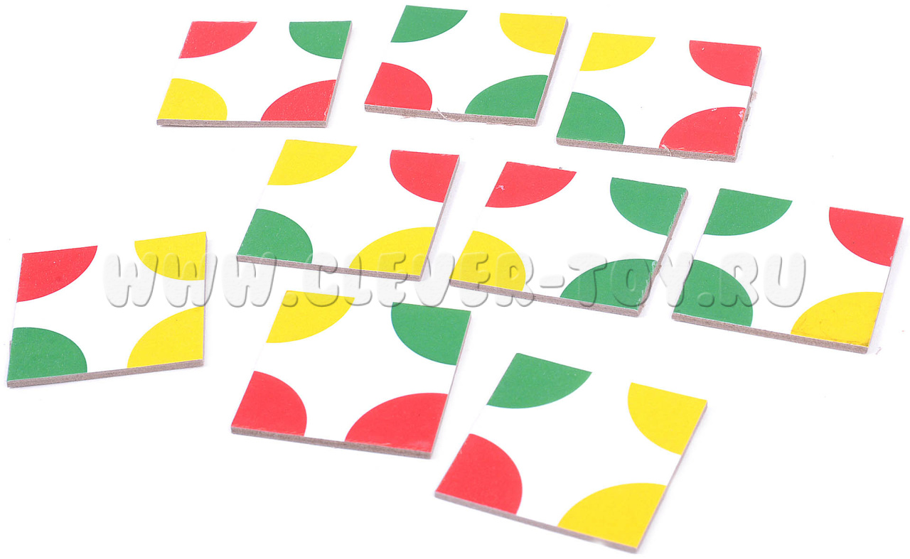 Игровые элементы этой головоломки - набор из 9 квадратных фишек с нанесенными на их углах разноцветными секторами круга. Следуя инструкции попробуйте выполнить все задания: от простых до сложных.