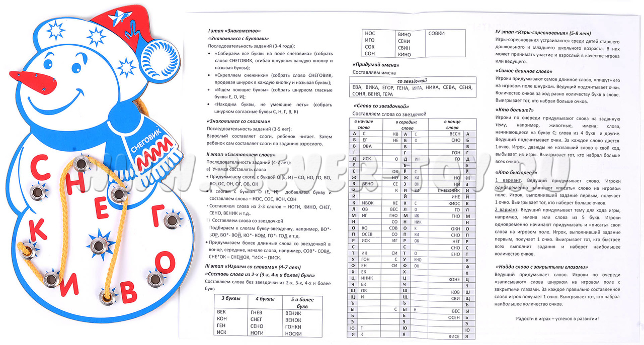 Как в нее играют: шнурок ребенок продевает в отверстие, затем закручивает его вокруг последующих букв, и таким образом составляет различные слова. Символ "звездочки" означает любую букву.