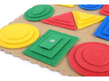 Разноцветные геометрические фигуры выполнены из безопасного современного материала – ковролина, аккуратно вырезаны на специальном станке, легко крепятся на ковролиную игровую основу с помощью многоразовых липучек.