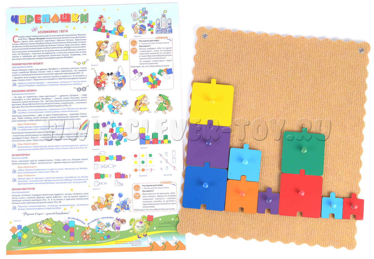 • фигурка-черепашка 21 штука 7-ми цветов радуги: 7 маленьких черепашек, 7 средних черепашек, 7 больших черепашек; все детали легко прикрепляются к игровому полю с помощью многоразовых липучек на оборотной стороне и специальных ручек на лицевой стороне каждой детали;