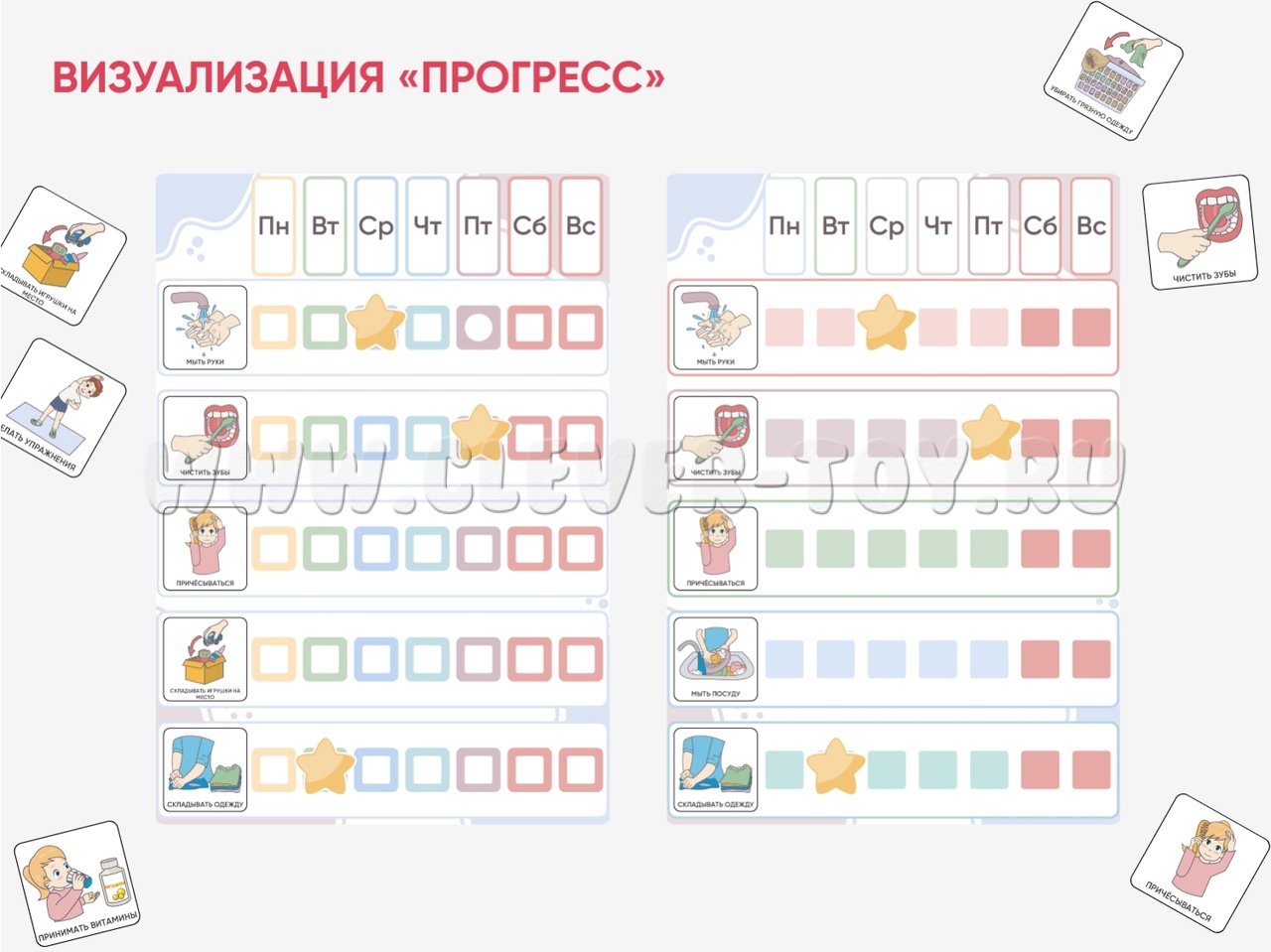 Пособие для организации обучения ребенка ежедневным рутинам: чистить зубы, собирать игрушки, собирать портфель и другие. Помогает фиксировать успешность формирования новой привычки и поддерживает мотивацию ребенка. Карточки для мальчика и для девочки.