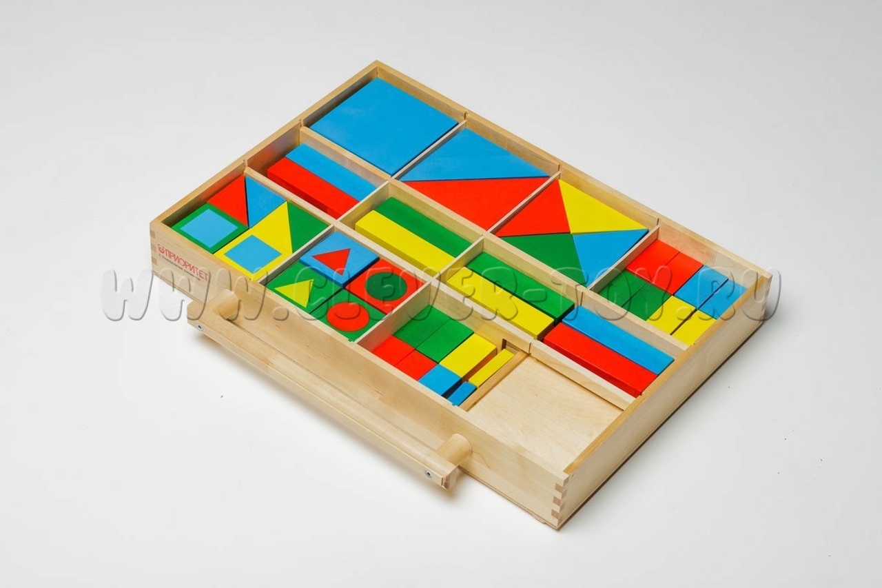 Более 100 фигур (квадраты, прямоугольники, треугольники) 4 цветов + доска-основа с бортиками. Ребёнок учится сравнивать, находить общее/различное, собирать изображения, осваивает геометрию и счёт.