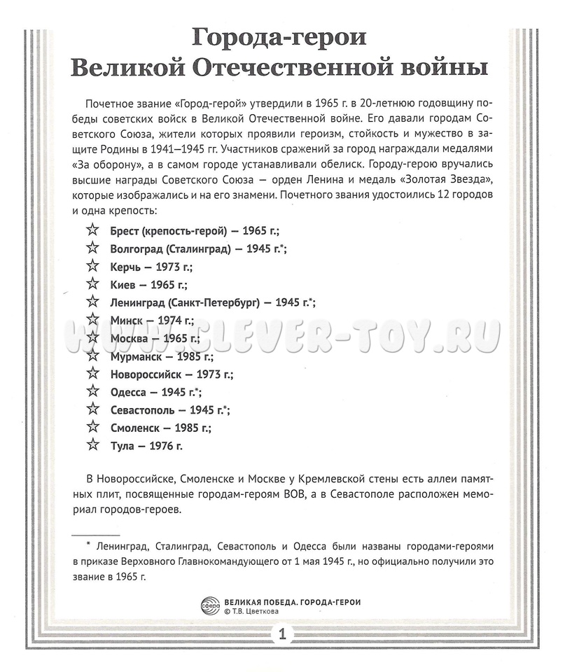 Пособие посвящено героическому подвигу 10 городов и одной крепости бывшего СССР в годы Великой Отечественной войны (1941-1945).