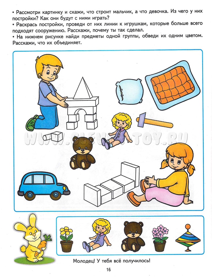 Развитие речи ребенка является одним из самых сложных элементов его деятельности, поэтому при выполнении заданий не торопите ребенка. В случае затруднения в произношении слов или описании предметов произносите или расскажите сами, четко проговаривая каждое слово, а затем попросите ребенка повторить сказанное.