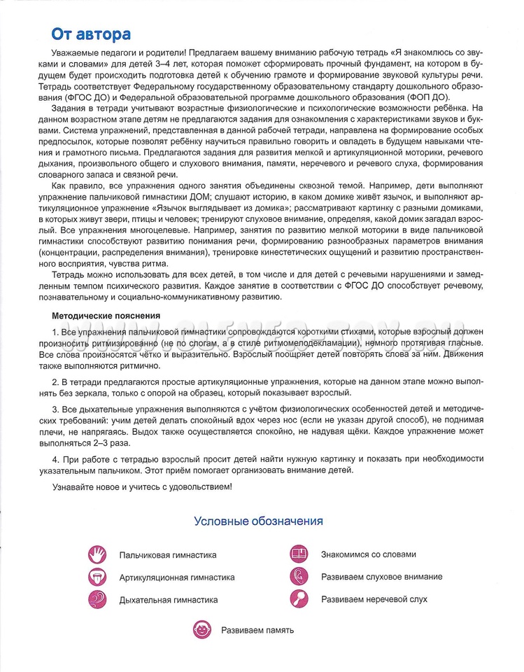 Тетрадь можно использовать для всех детей, в том числе и для детей с речевыми нарушениями и замедленным темпом психического развития. Каждое занятие в соответствии с ФГОС ДО способствует речевому, познавательному и социально-коммуникативному развитию.