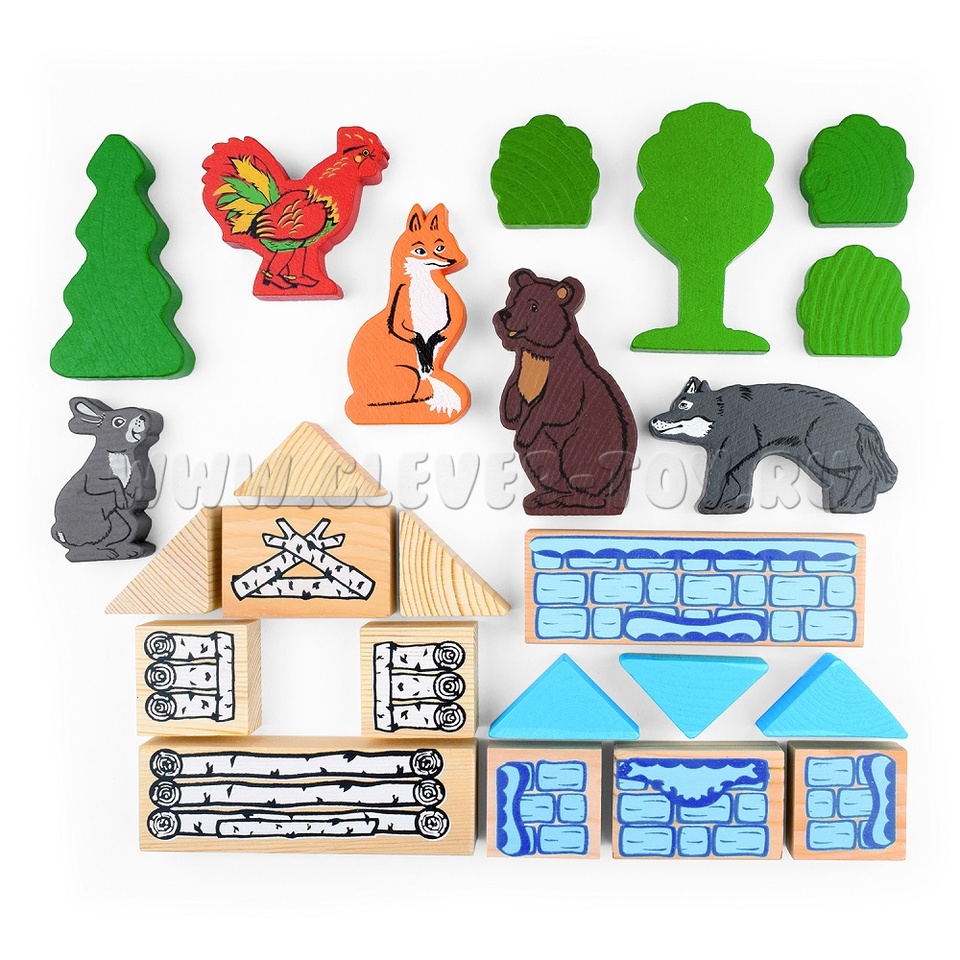 В набор входят деревянные модели персонажей и декорации сказки "Заюшкина избушка" (всего 24 детали), а также вкладыш с текстом сказки.
