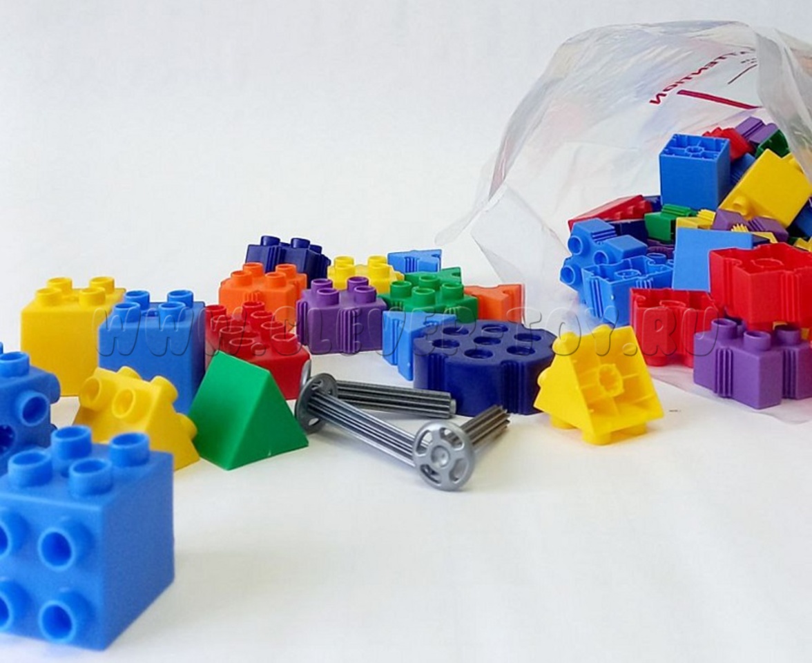В составе конструктора детали различной геометрической формы – 10 разных геометрических форм, размеров, в том числе параллелепипеды разных размеров, треугольные призмы, цилиндры, кубы, что позволяет создавать множество различных конструкций, сооружений, от простых 2-хмерных (2D), до более сложных, объемных 3D-моделей.