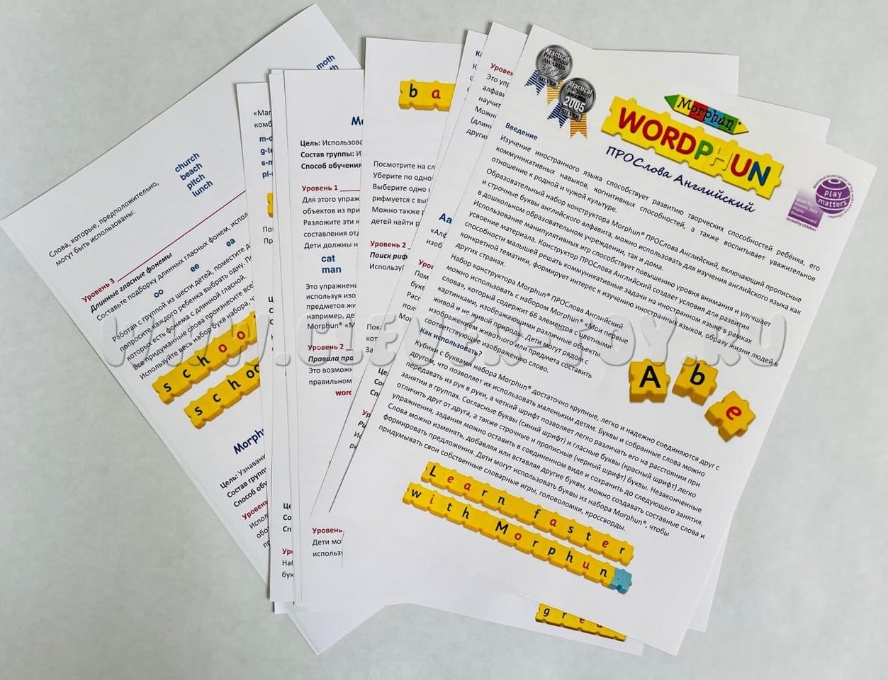 Обучающий конструктор Морфáн «ПРОслова Английский язык» применяется для увлекательных занятий английским языком и чтением. Состоит из деталей желтого цвета с нанесенными буквами и знаками препинания, соединяемых особым способом, исключающим неправильное расположение букв. Соединение крепко держит детали между собой, что очень удобно при составлении слов или предложений. Собранное слово ребенок может не только положить на стол (парту), но и взять в руки и показать педагогу (родителю), который сразу видит результат и если нужно исправит ошибку. Цветовое выделение букв дает возможность ребенку быстрее найти гласные (красный цвет), согласные (синий цвет) и заглавные буквы (черный цвет). Конструктор помогает выучить буквы, собирать из букв слоги, а затем фразы и предложения, осваивать правила орфографии и пунктуации. Комплекс заданий, упражнений и игр дает возможность значительно расширить словарный запас, развить память, речевые навыки, воображение, мышление детей.