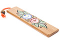 Колотушка с росписью для самых юных музыкантов представляет собой деревянный брус размерами: 140 мм х 30 мм х 5 мм. В верхней части бруса посредством капронового шнура крепится бусинка диаметром 16 мм. На сторонах в 140 мм нанесена роспись. Материал: бук, береза.