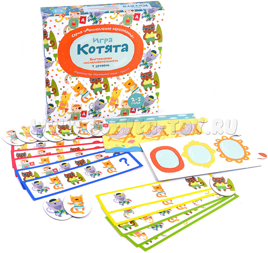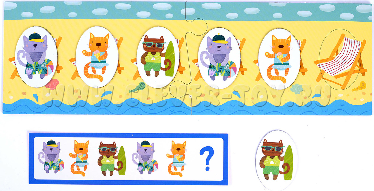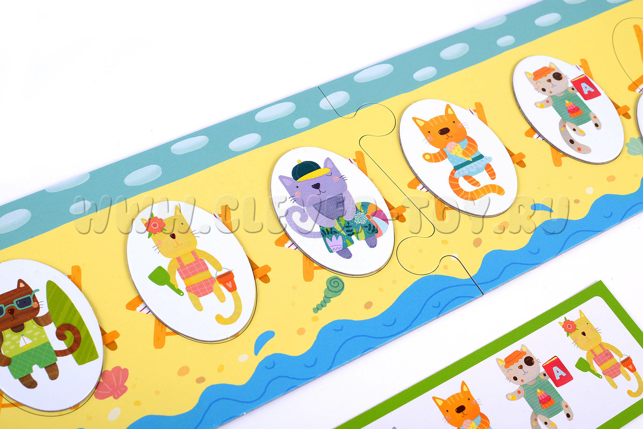 - Игра для поля с шезлонгами (обратная сторона игрового поля). Начинайте с заданий в зеленой рамке: воспроизводите заданную карточкой последовательность котят. Более сложные задания предлагают не только продолжить ряд, но и установить взаимосвязь и закончить последовательность самостоятельно. К этим заданиям стоит переходить, когда малыш уверенно справляется с зелеными карточками.