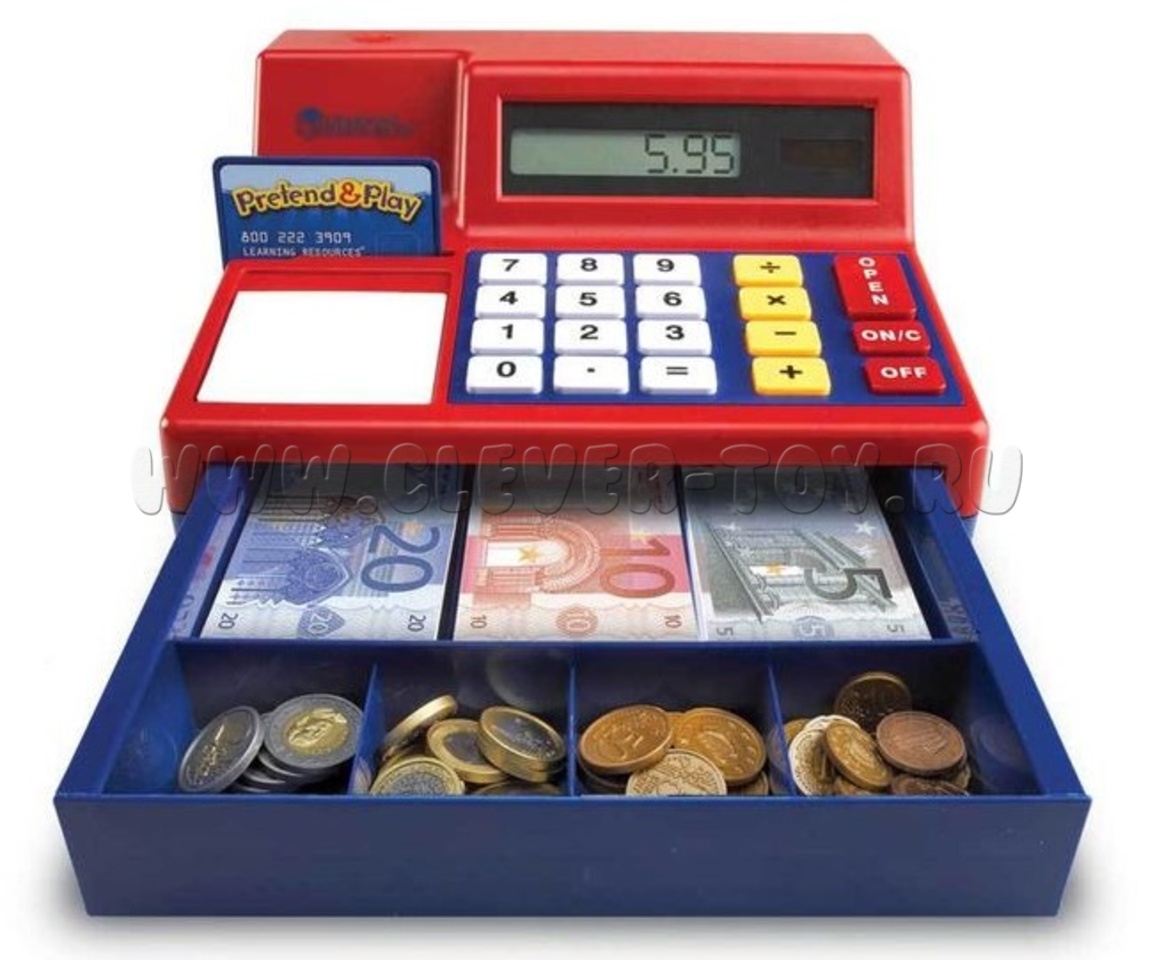 Игрушечный кассовый аппарат с рабочим денежным ящиком и калькуляторм на солнечной батарее.